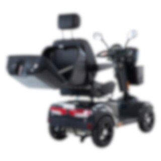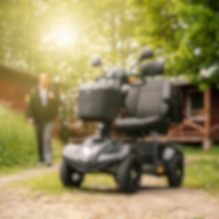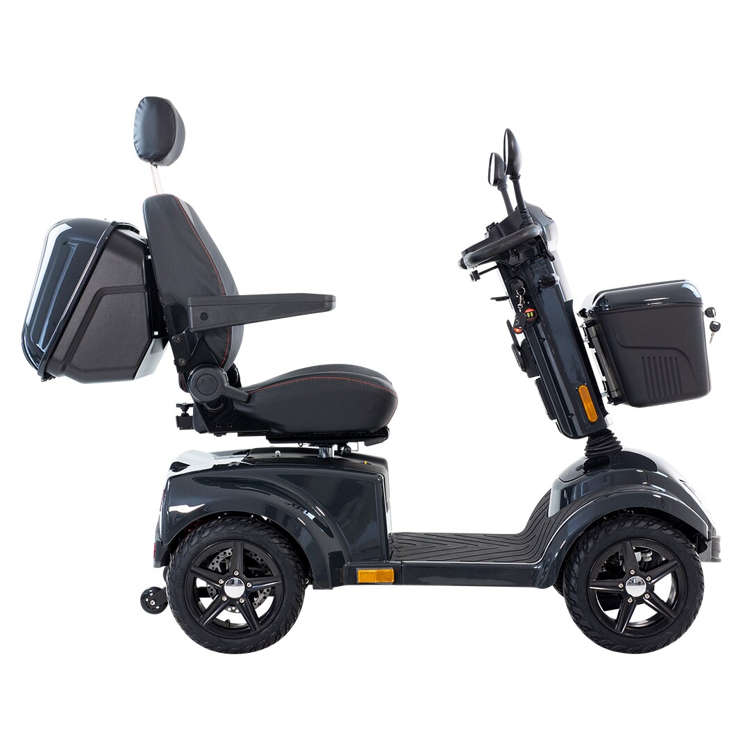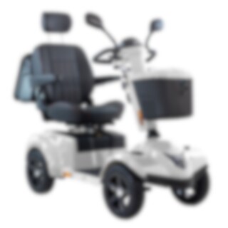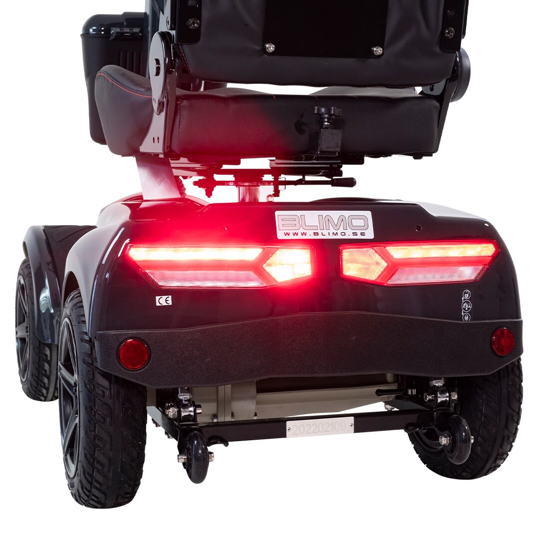 Blimo x-950 er en av våre fremste turscootere. Den har en elektrisk motor på hele 950 W og en batteripakke med to 75 Ah-batterier. Fortauskanter eller oppoverbakker er dermed ikke noe problem for x-950, som har fjæring på hvert enkelt hjul.