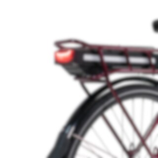 Sykkelens litiumbatteri er plassert i bagasjeholderen. Det går helt fint å lade batteriet montert på sykkelen, men alternativt kan det tas av for lading på et annet sted.