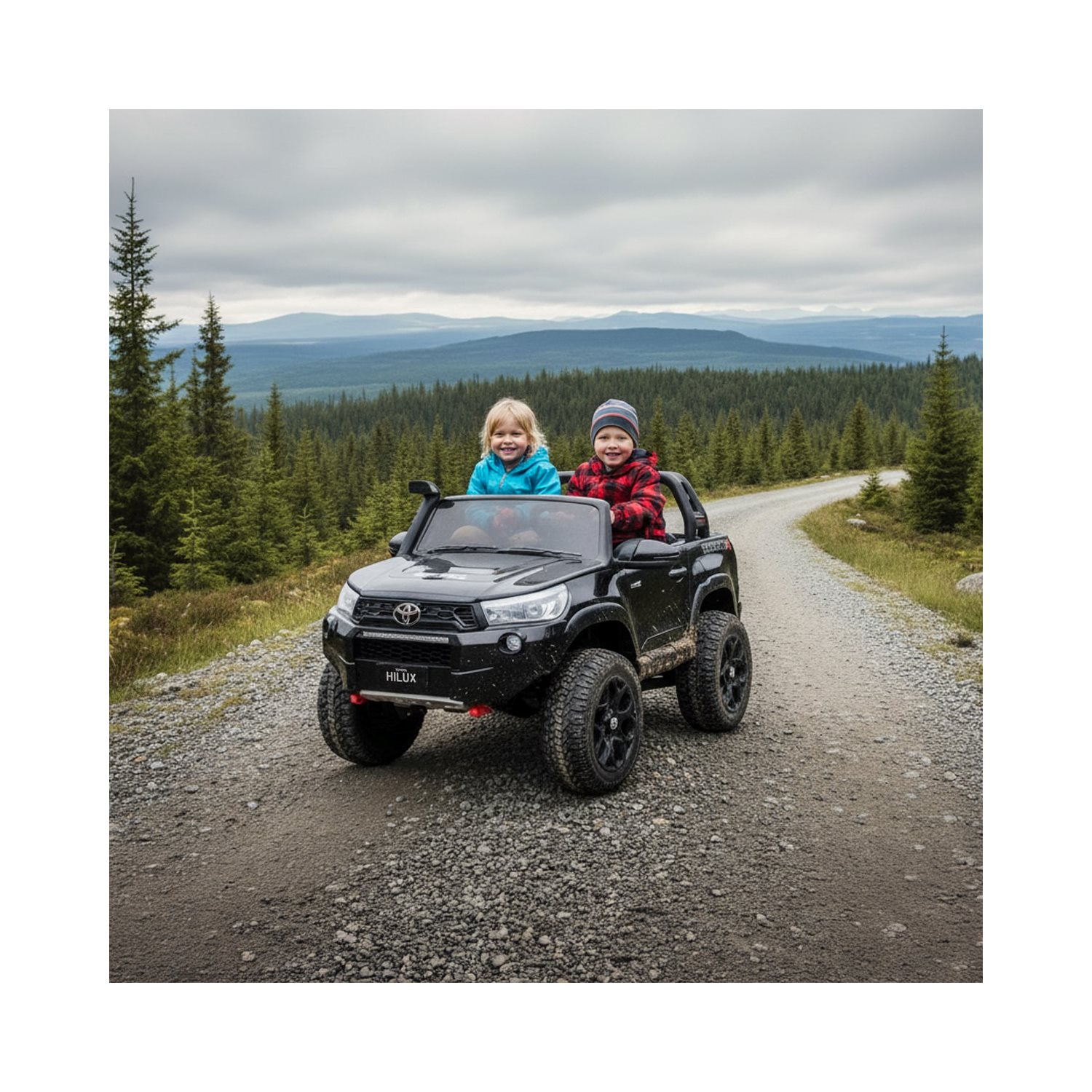 Stor og kraftig pickup med firehjulsdrift og plass til to barn! Vår Elbil Toyota Hilux 4WD Svart er virkelig noe som fanger blikk, og med finesser som åpningsbare dører og bakluke, LED-belysning samt bilstereo gir det en suveren opplevelse. Bilen har myk start/stopp for behagligere drift uten rykkete kjøring. Ekte gummidekk og støtdempere gir god komfort. Leveres med fjernkontroll, 2.4G.