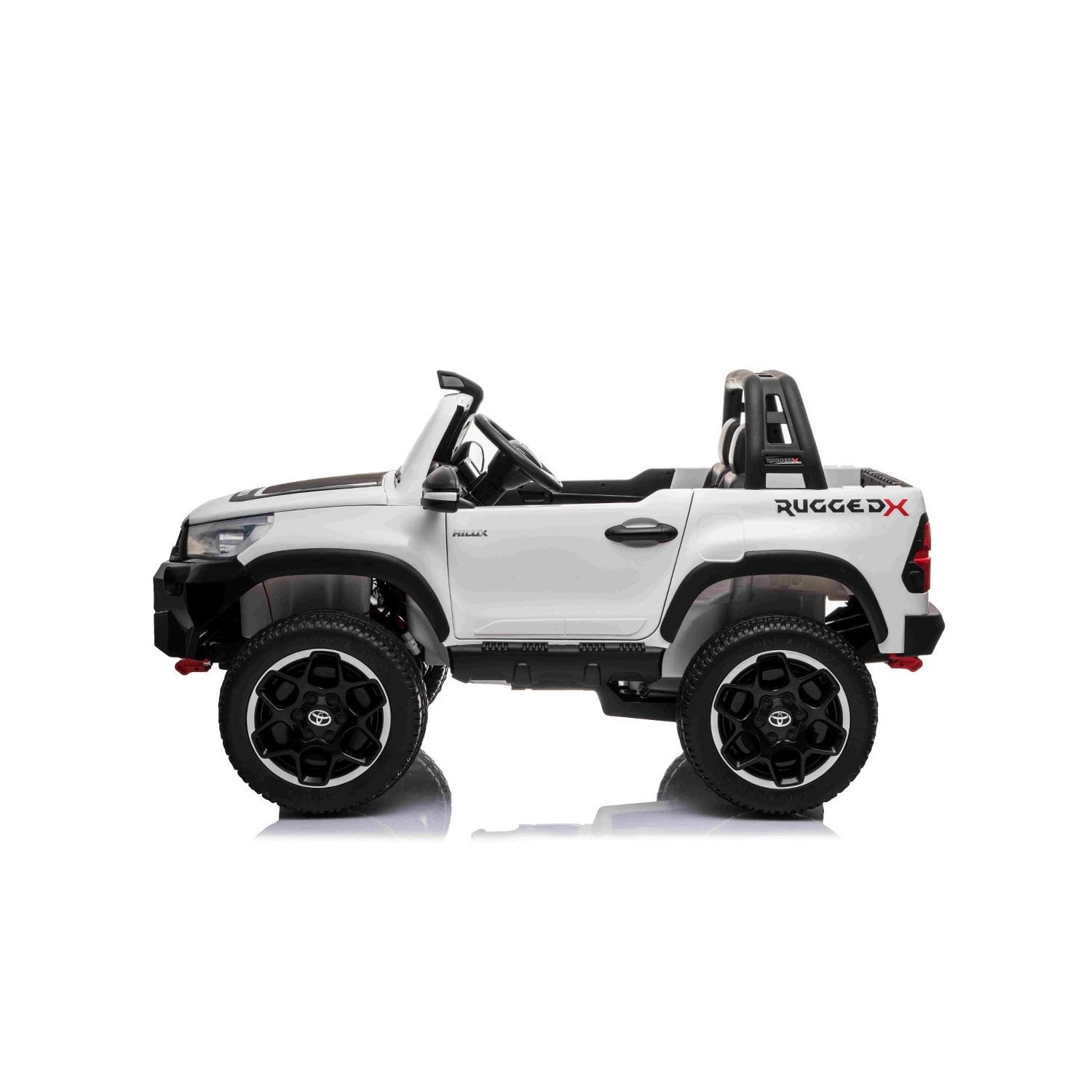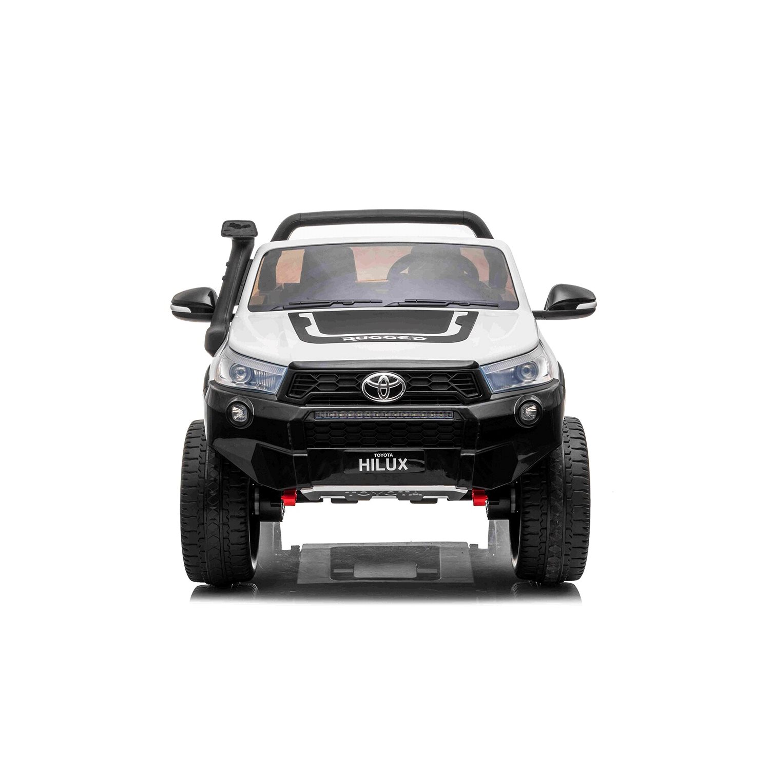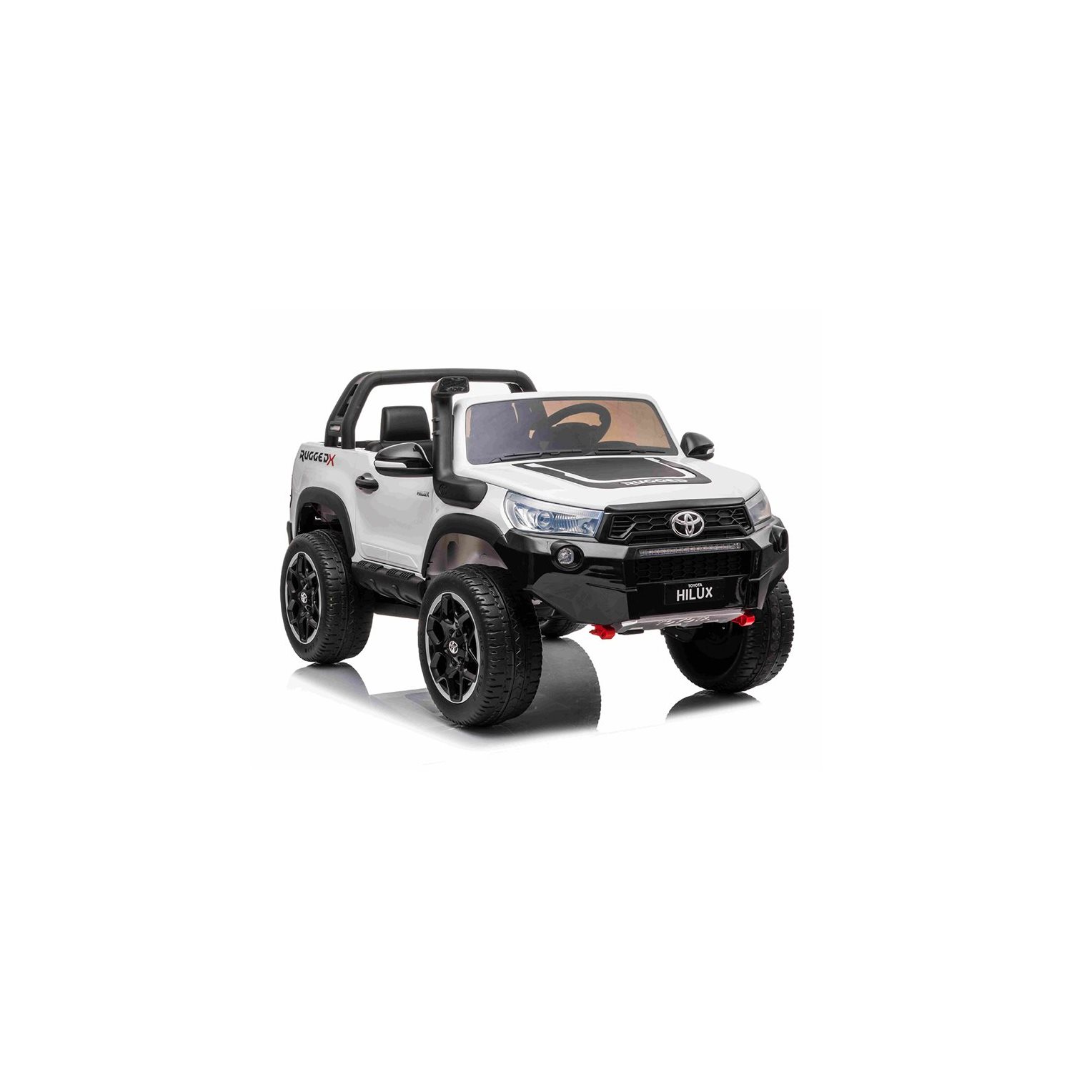 Stor og kraftig pickup med firehjulsdrift og plass til to barn! Vår Elbil Toyota Hilux 4WD Hvit er virkelig noe som fanger blikk, og med finesser som åpningsbare dører og bakluke, LED-belysning samt bilstereo gir det en suveren opplevelse. Bilen har myk start/stopp for behagligere drift uten rykkete kjøring. Ekte gummidekk og støtdempere gir god komfort. Leveres med fjernkontroll, 2.4G.
