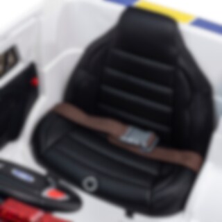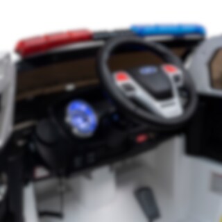 Tøff politibil i SUV-versjon med fungerende blålys, støtdempere på hjulene, åpningsbare dører, myke dekk i skumplast, LED-lys framme og bak og mye mer. Dessuten har bilen en mikrofon slik at den lille konstabelen kan rope ut advarsler til de som er rundt. Separat knapp finnes for å slå på blålysene når det er tid for å kjøre og fange tyver! Innebyggd stereo med noen forhåndslagrede låter samt mulighet til å koble til MP3-spiller via medfølgende kabel (3,5 mm kontakt). Bilen har doble motorer på 35W/stk samt tre hastigheter framover og revers. Fjernkontroll 2,4G er inkludert. Myk start/stopp.