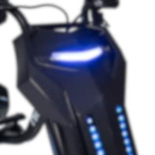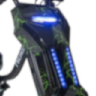 En virkelig høydepunkt er belysningen. Fargerike LED-lys i hjulene og under setet skaper et kult inntrykk både i dagslys og mørke. I tillegg finnes en fremoverrettet LED-lampe som lyser opp veien ved kjøring i skumringen.